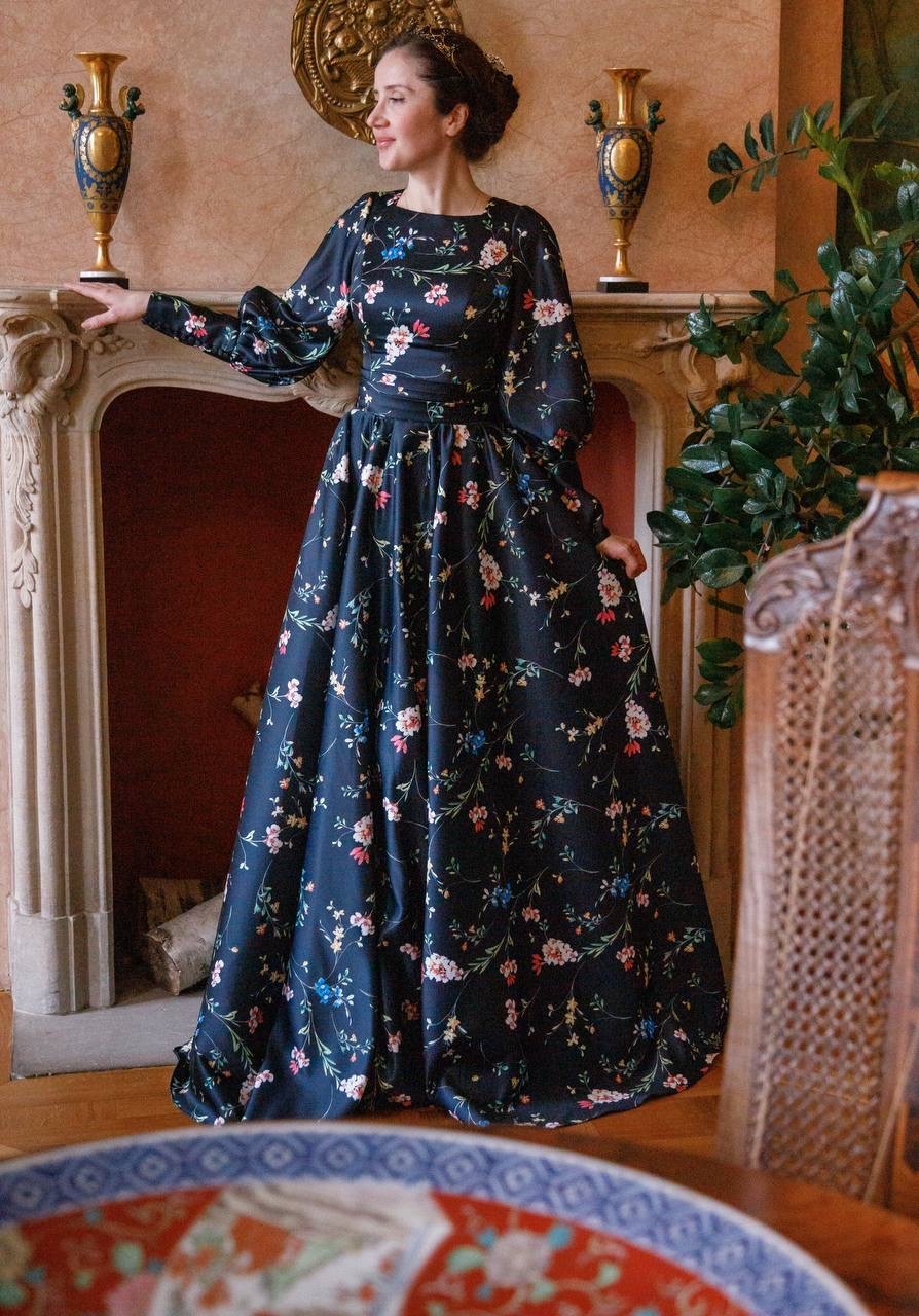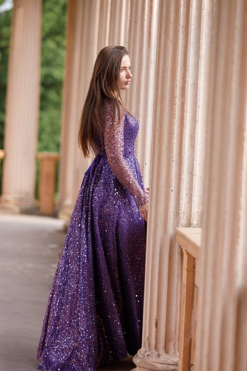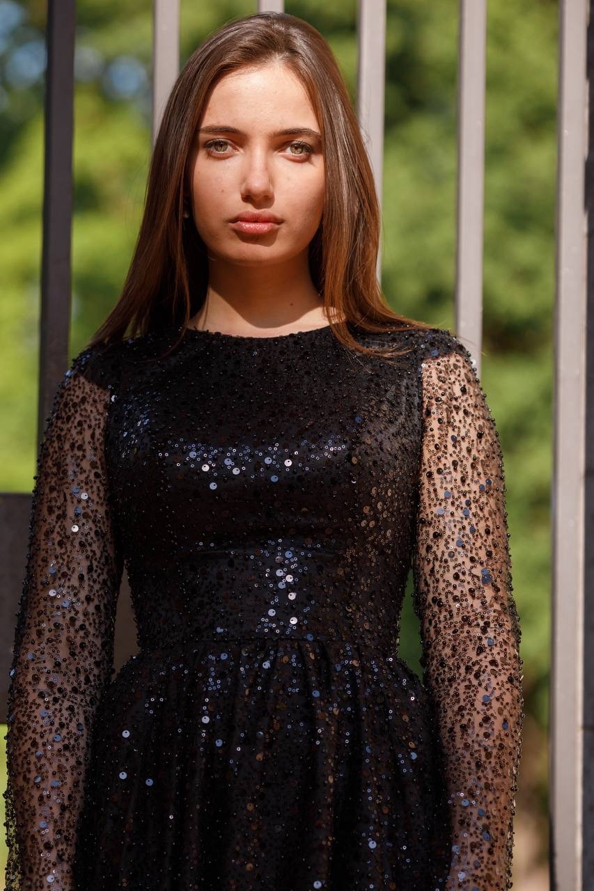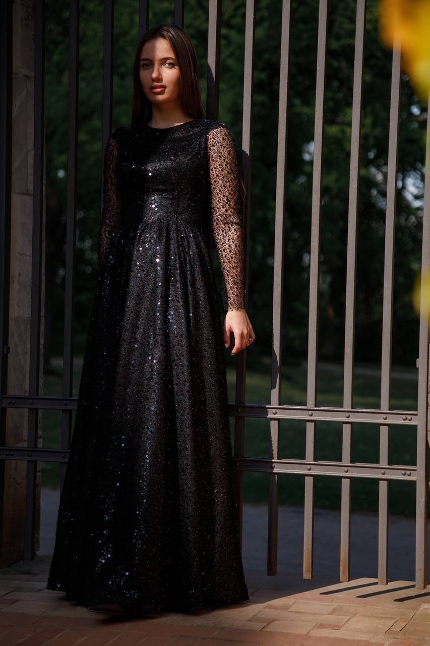 Платье из расшитой черной паетки и мелких жемчугов, подкладка платье из атласа. Так же данное платье имеет корсет, что дает возможность регулировать его на один размер больше и меньше. Размер S/M
